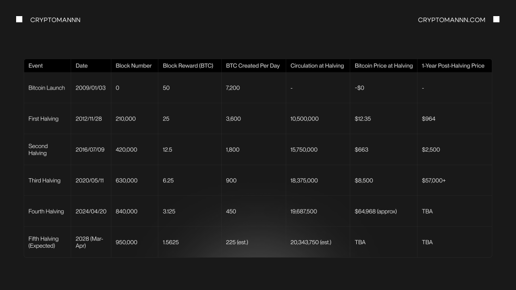 Четвертий халвінг відбувся 20 квітня 2024 року. Нагорода знизилася до 3,125 BTC. До цього моменту понад 95% всіх BTC вже було видобуто, а на ринок вийшли спотові ETF, що забезпечили приплив інституційного капіталу. Ціна BTC під час події трималася в районі $62 000, залишаючись стабільною на тлі високої ліквідності та зрілості інфраструктури. Зараз BTC торгується в районі $100 000.